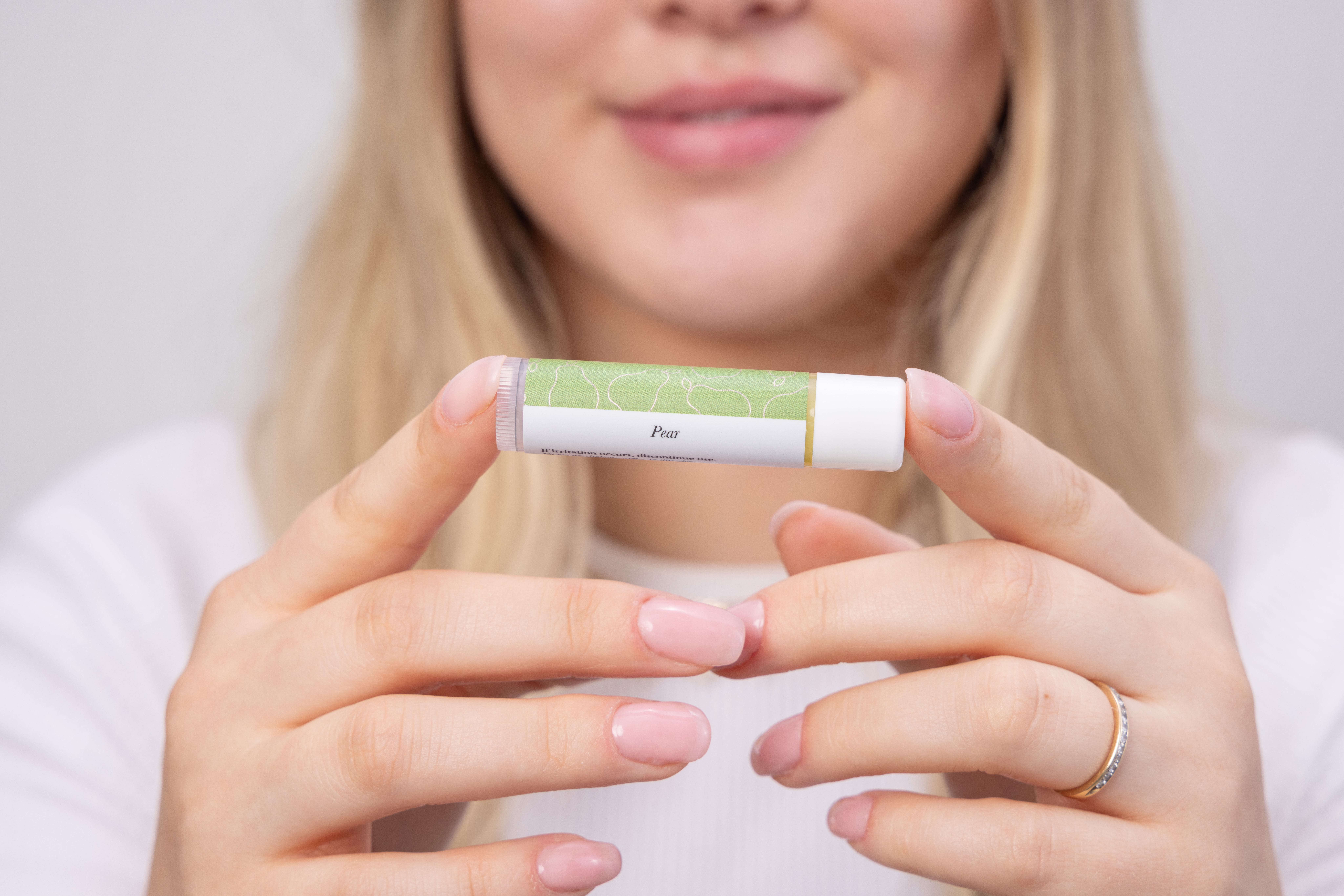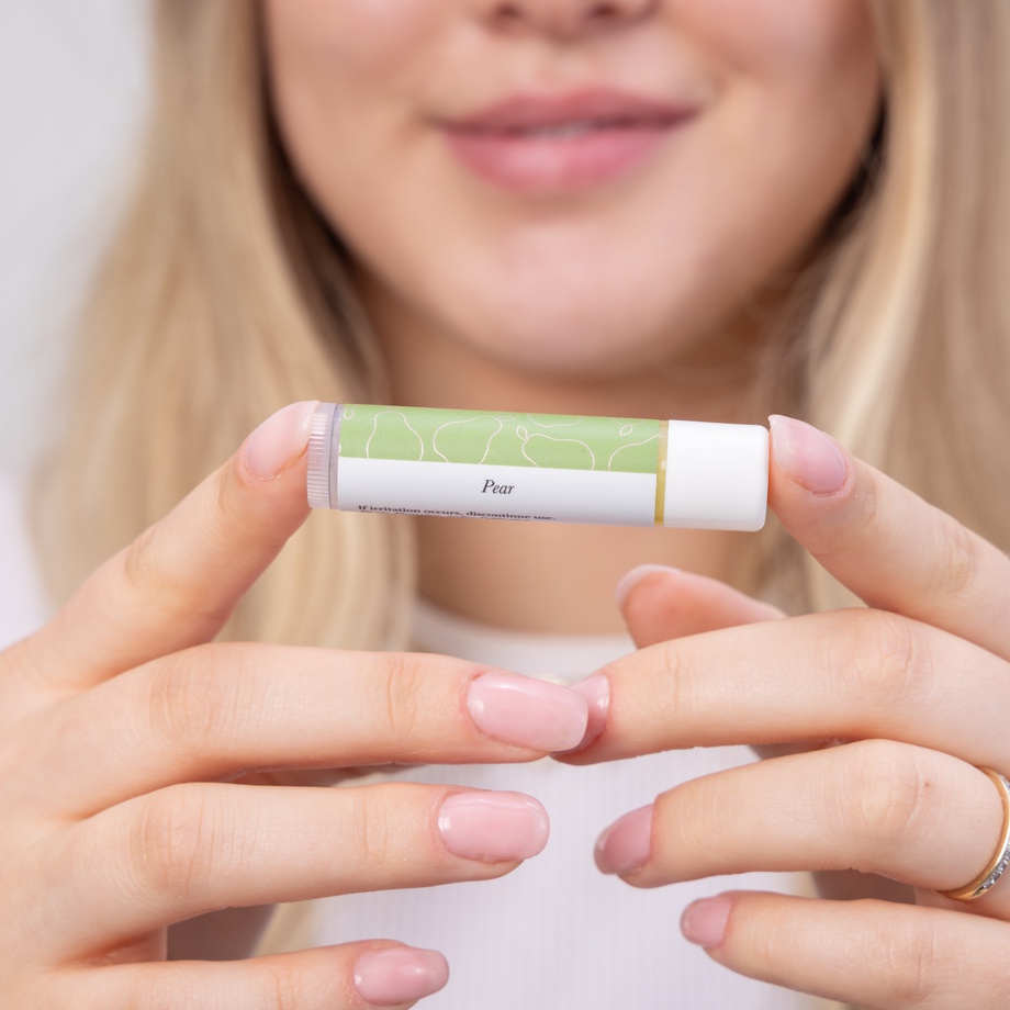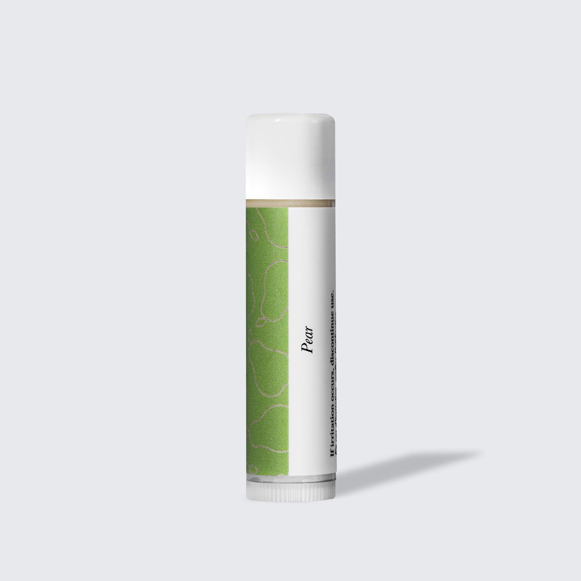 ORGANIC SUNFLOWER OIL, ORGANIC BEESWAX, ORGANIC ICED PEAR FLAVOUR, ORGANIC COCONUT OIL, VITAMIN E, ORGANIC ROSEMARY EXTRACT, ORGANIC CALENDULA EXTRACT, ORGANIC STEVIA.